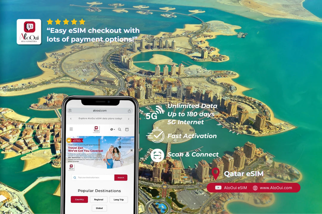 Experience seamless connectivity in Qatar with AloOui’s prepaid eSIM! Your travel-friendly solution for instant 4G or 5G data. Whether you’re visiting Doha, The Pearl, Souq Waqif, or Lusail Stadium, enjoy fast internet without the hassle of a physical SIM. Perfect for World Cup fans, business travelers, and vacationers, our plans range from 1 GB to unlimited, include instant email delivery, no ID verification, and hotspot sharing. Stay connected the smart way across Qatar’s modern cities and cultural gems.