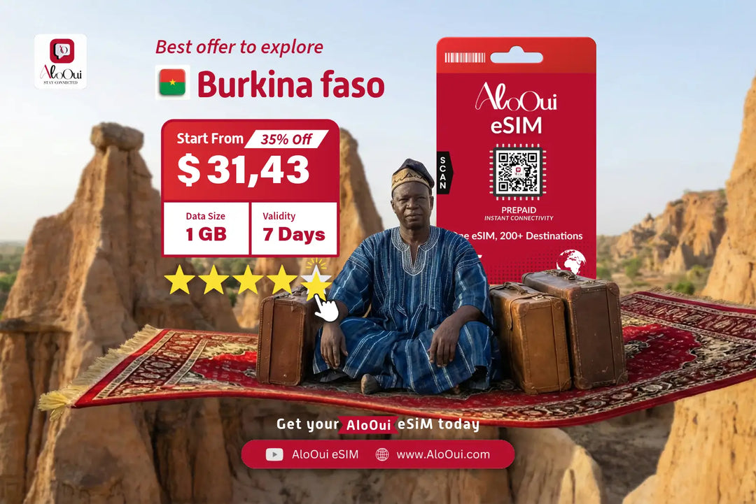 Stay connected with AloOui’s Burkina Faso prepaid eSIM, your ideal travel partner across Burkina Faso. Enjoy fast 5G/4G LTE data in top destinations like Ouagadougou and Bobo-Dioulasso. Whether exploring cities or rural areas, choose flexible plans from 1 GB to unlimited. Get instant email delivery, hotspot support, no ID verification, and reliable coverage. Perfect for tourists, business travelers, and digital nomads needing seamless data on the go.