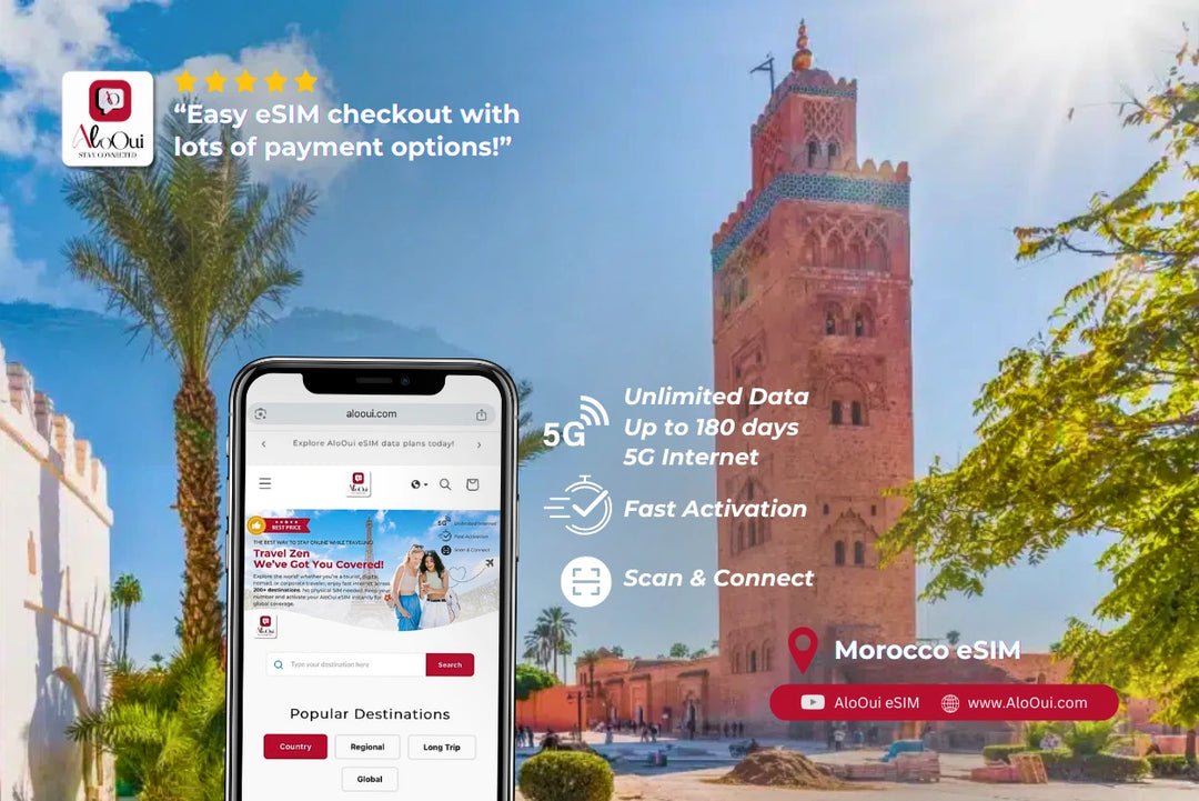 Stay connected with AloOui's Morocco prepaid eSIM! Your perfect companion for smooth travel all across Morocco. Enjoy high-speed 5G or 4G LTE data in top destinations like Marrakech, Casablanca, Fes, Rabat, and Agadir. Whether you're exploring historic medinas, vibrant souks, or stunning desert landscapes, our flexible plans from 1 GB to unlimited keep you connected effortlessly. With instant email delivery, hotspot support, no ID verification, and reliable nationwide coverage, it’s the ideal choice for vacationers, business travelers, and digital nomads visiting Morocco.