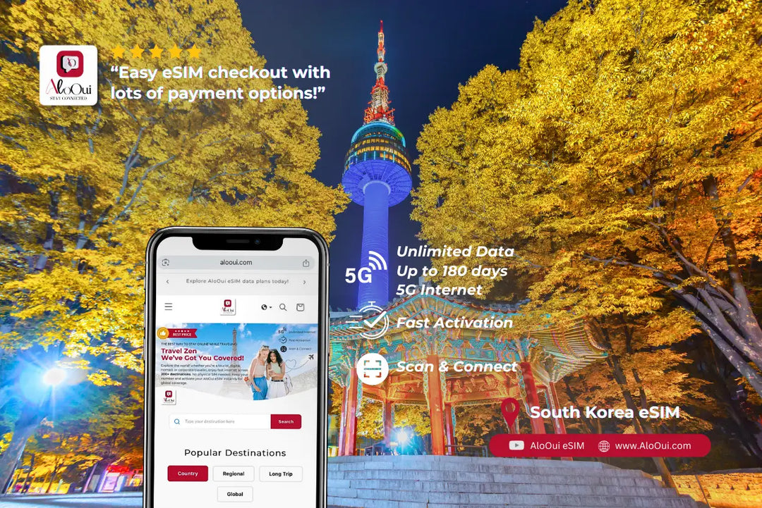 Stay connected with AloOui's South Korea prepaid eSIM, your perfect companion for smooth travel across South Korea. Enjoy high-speed 5G/4G LTE data in top destinations like Seoul, Busan, Jeju Island, Incheon, and Daegu. Whether you’re exploring bustling cities, scenic islands, or cultural landmarks, our flexible plans, from 1 GB to unlimited, keep you connected effortlessly. With instant email delivery, hotspot support, no ID verification, and reliable nationwide coverage, it’s the ideal solution for vacationers, business travelers, and digital nomads visiting South Korea.